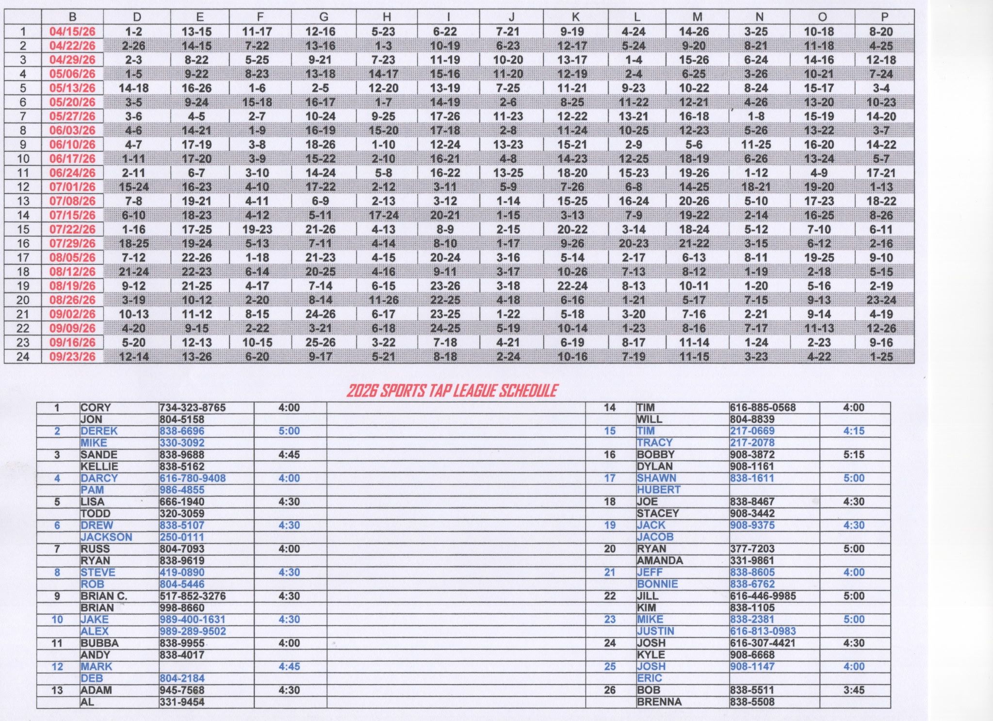 2026 Sports Tap League Schedule